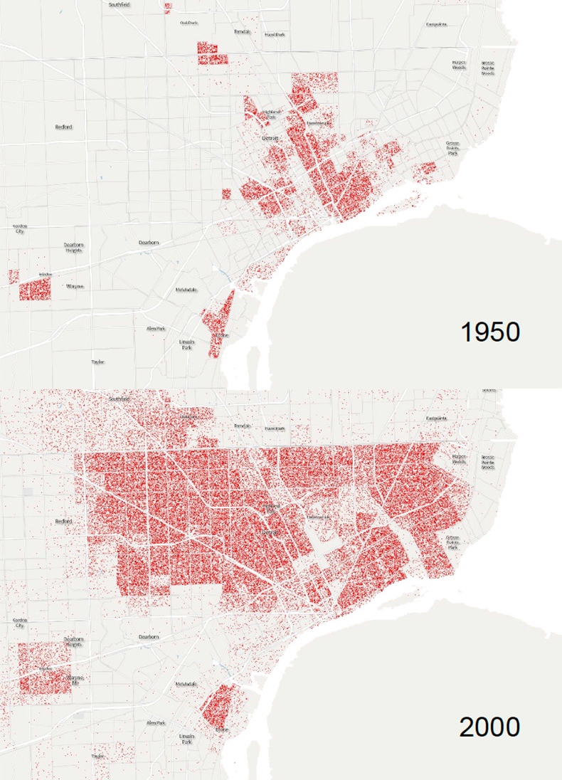 To the right are demographic maps of Detroit from 1950 & 2000, each dot representing 10 black residents.
